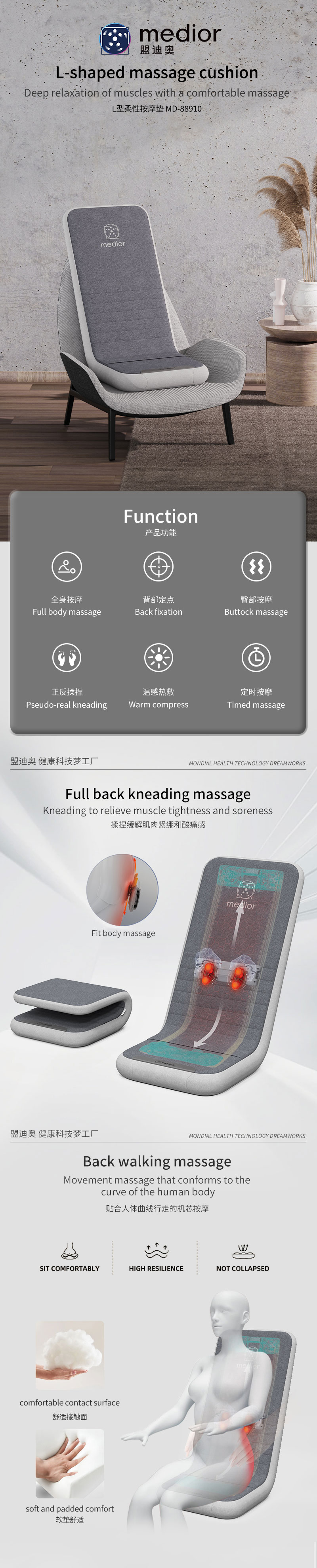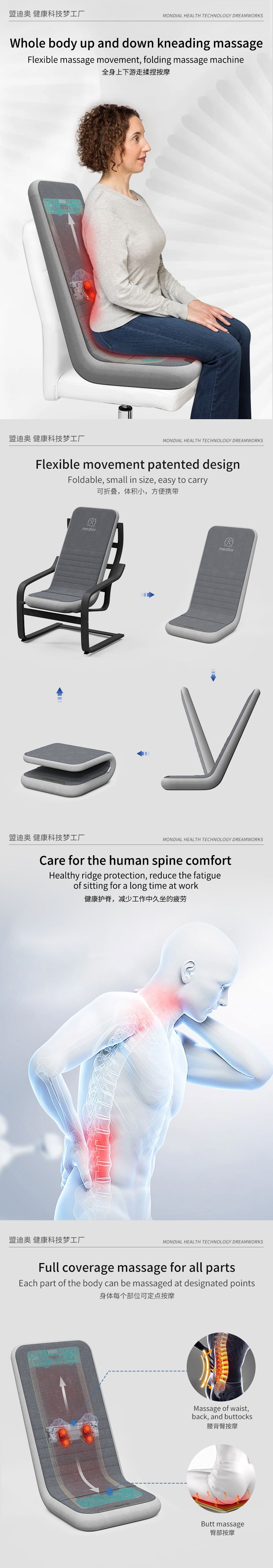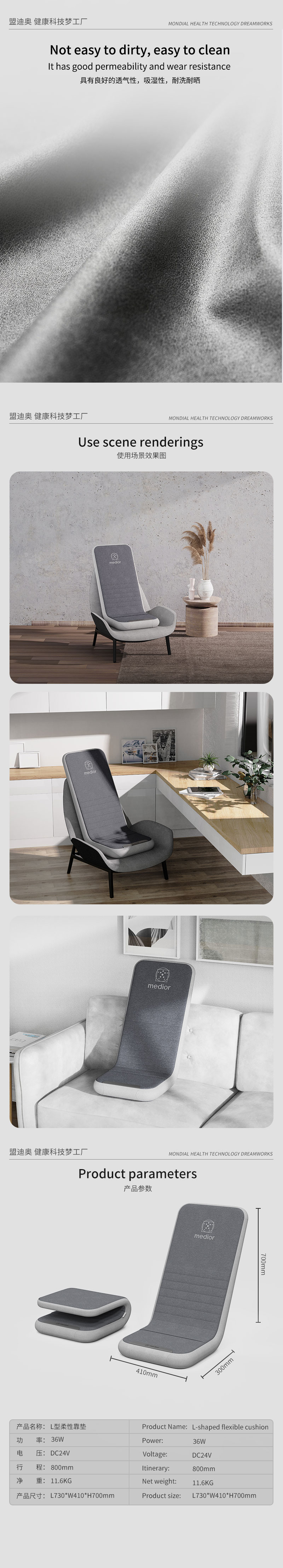 1、L型機(jī)芯結(jié)構(gòu),對(duì)折包裝縮小體積2、獨(dú)家專(zhuān)利柔性機(jī)芯3、力度三檔調(diào)節(jié),定點(diǎn)按摩,腰背按摩、臀腿按摩、全背按摩模式選擇4、背部行走揉捏,按摩區(qū)域加長(zhǎng)到從肩膀到大腿;5、更加貼合不同款式的椅子整體可對(duì)折收納6、亞馬遜標(biāo)準(zhǔn)包裝尺寸